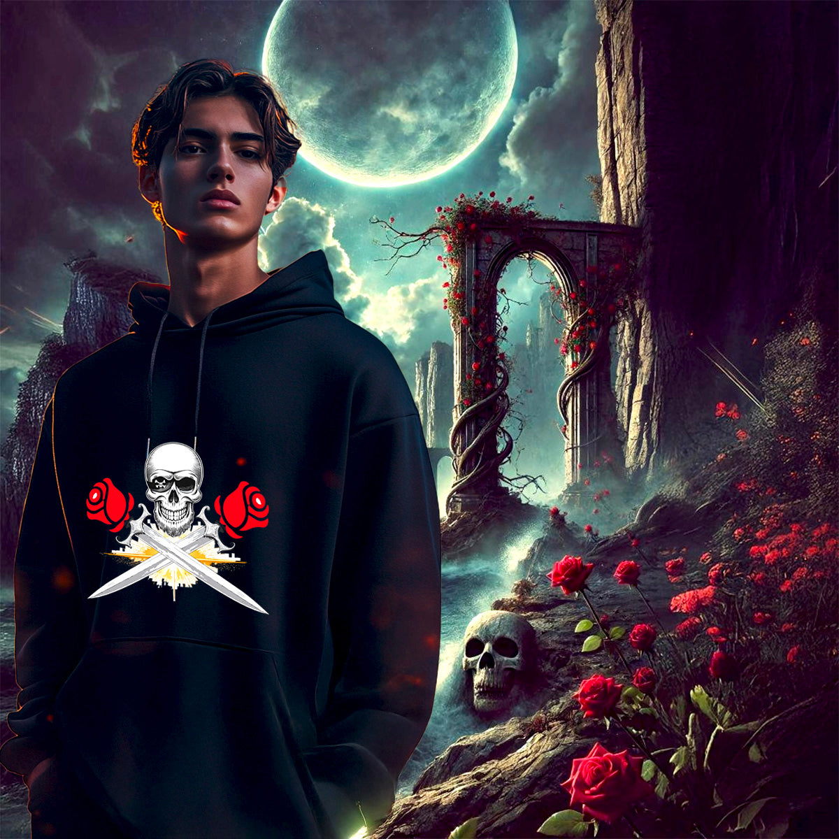 Le crâne, emblème de l’acceptation de la mort, rappelle le courage nécessaire pour embrasser pleinement la vie, tandis que les roses rouges symbolisent la passion et la beauté que les Gardiens protègent farouchement. Les épées croisées, entrelacées de roses, incarnent cette idée que l’amour, même paré d’épines, est la force la plus redoutable. Ce n’est pas un amour doux et passif, mais une flamme intense, indomptable, qui guide les âmes libres.